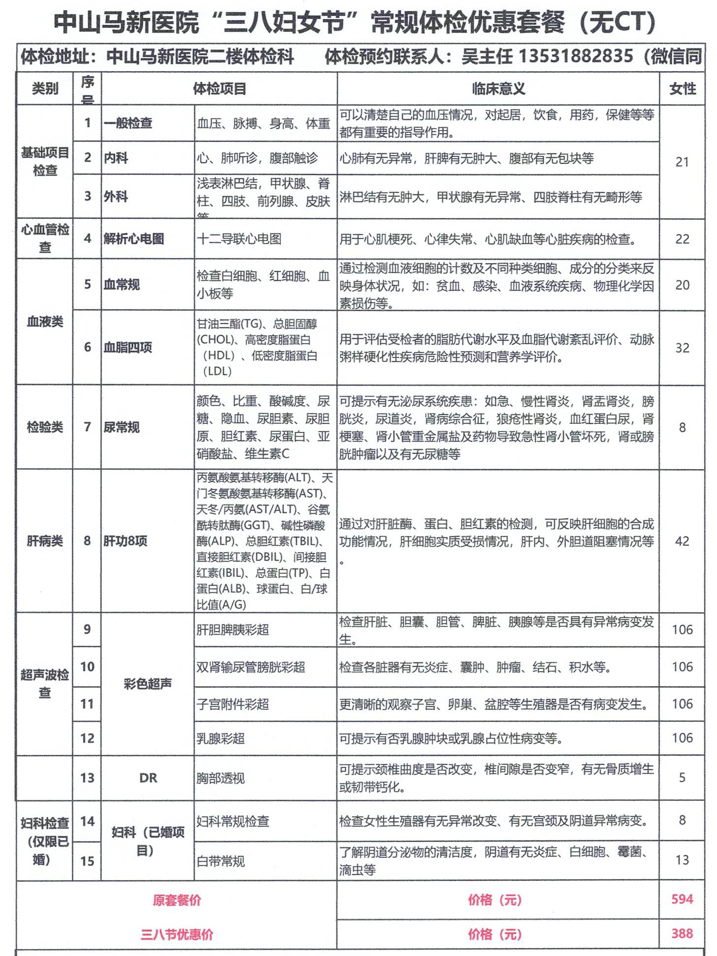 (中山马新医院拥有高端螺旋CT机、彩色超声诊断仪、数字化X光机(DR)、电子腹腔镜、电子胃肠镜、全自动生化分析仪、全自动凝血功能检测仪等一大批先进的体检设备,组建了一支由各医疗专业学科专家组成的专家组,为受检人提供全方位的健康指导、保健咨询、临床诊治等服务,实现“早发现、快治疗”的目的!)